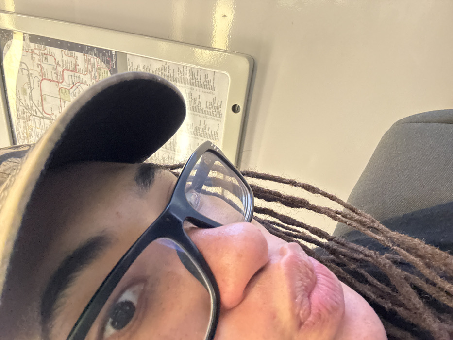 The image captures a close-up portrait of an individual from the left side of their face, taken within a public transport vehicle on the RATP Île-de-France network, likely an RER train serving the city of Antony, France. The subject has dark skin, is wearing black-framed rectangular glasses, and a dark-brimmed cap, possibly with a camouflage pattern, partially visible on the upper right side of their head. Dark dreadlocks or braids are visible, hanging below their ear. Their left eye is open and directed towards the camera, and their lips are slightly puckered. A portion of a dark-colored garment is visible on their left shoulder. In the upper right background, a "RATP Île-de-France" transportation map, featuring various transit lines, is mounted on a light-colored, possibly beige, wall panel. The map is secured within a light-colored frame, with a visible fastener at its lower center. The overall environment is consistent with the interior of a commuter train car.
