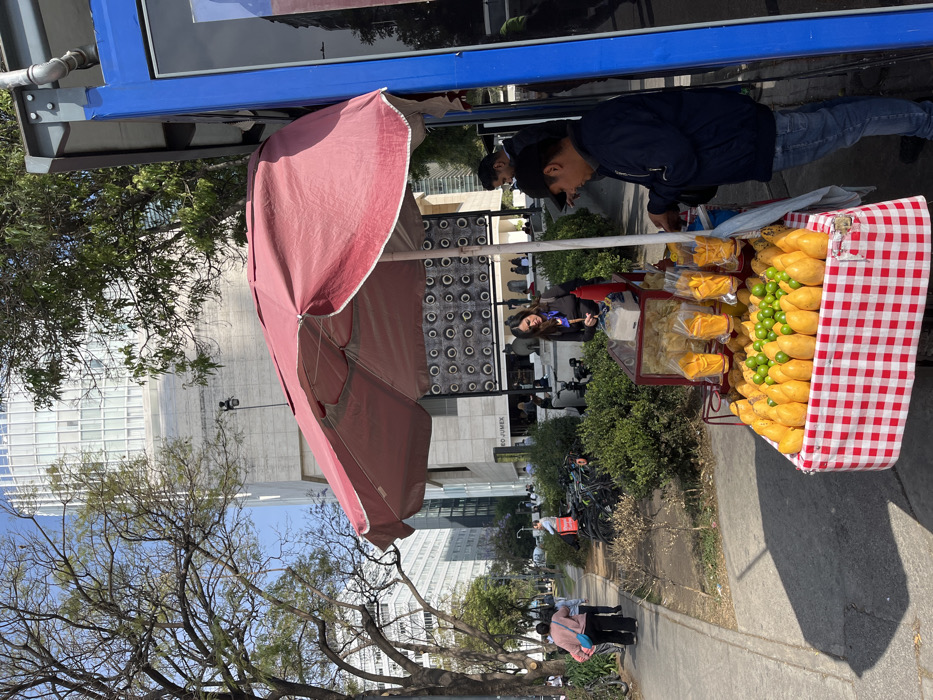 A fruit vendor stands by his cart, laden with mangoes and limes. A red and white checkered cloth lines the cart. A large red umbrella provides shade. A man in a blue jacket browses the cart's offerings. People walk by in the background, near a building with circular patterned walls. Trees and a tall building are also visible.