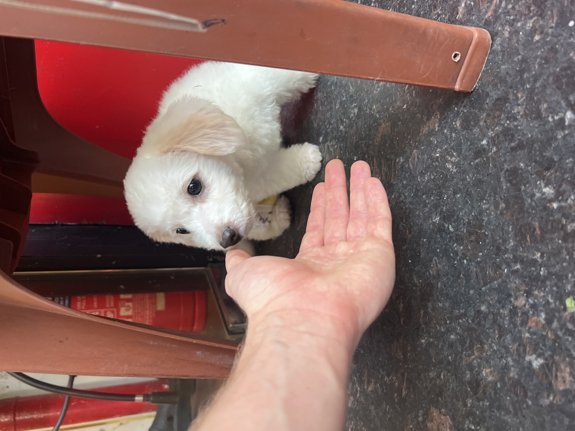 An indoor scene in Thủ Đức, Vietnam, features a small, white, fluffy puppy with light tan ear patches and dark eyes, positioned beneath a reddish-brown plastic chair. A human left hand, palm open and extended, reaches towards the puppy from the foreground. The puppy's lower body is partially obscured by the chair's leg; its head is turned towards the extended hand. The flooring is a dark, speckled material. In the background, behind the puppy and the chair, a prominent red cylindrical object, consistent with a fire extinguisher, is visible, alongside another red item and a black cable on the left. Two reddish-brown plastic chair legs frame the central subjects.