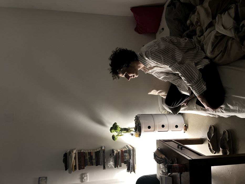 A person with curly hair sits on a bed, wearing a striped shirt and dark pants. A pink pillow is visible behind them. The room is dimly lit with a desk, books on a shelf, and an indoor hydroponic garden. A pair of sandals sits beside the bed. The wall is plain and painted a light color.