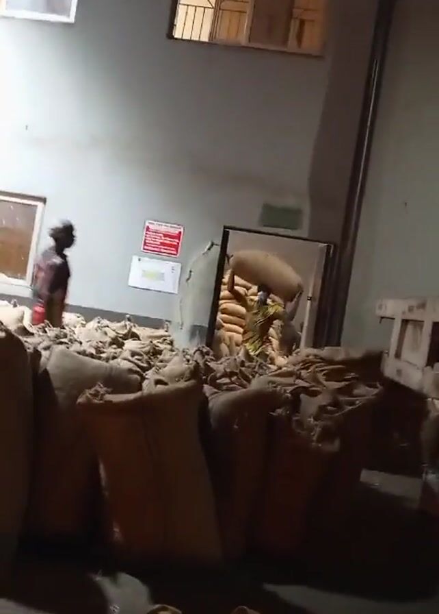 The scene appears to be inside a warehouse or storage facility. There are numerous burlap sacks piled high on the floor, filling much of the frame. A pair of yellow sandals are visible on the floor in the foreground. Two individuals are present: one is carrying a large sack on their head and shoulders, walking leftwards over the sacks. The second individual is standing in a doorway in the background, appearing to be stacking or organizing sacks inside the room. The building has several windows and a sign mounted on the wall. The lighting is somewhat dim and the image is a little shaky.
