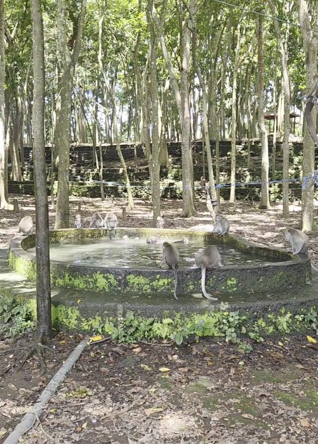 - "group of monkeys in a forest, gathered around and in a small, circular stone pool of water" by FM-2KXw22, licensed under CC BY 4.0