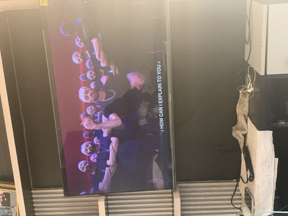 An indoor scene in Barakin Lerawi, Nigeria, depicts a flat-screen television displaying a video. The screen shows a group of approximately fifteen adult males, all with light-colored hair and beards, predominantly wearing black tops. Several individuals have necklaces with pendants, and multiple men stand with their arms crossed. A central figure, wearing a silver chain and patterned dark trousers, is prominent, with his right arm raised and bent at the elbow in a gesturing motion. The background of the video is a uniform reddish-purple. Subtitles reading "♪ HOW CAN I EXPLAIN TO YOU ♪" are visible at the bottom of the screen, along with a faint "Hisense" brand logo. Below the television, on a dark-toned furniture surface, a white towel partially covers the surface. On the towel, from left to right, are a silver smartphone connected by a light blue charging cable to a white power strip, and a black television remote. A crumpled light brown fabric and white wired earphones are positioned further right on the dark surface. A vertically striped light-colored wall paneling is present to the left of the television. The wall directly behind the lower furniture is dark. A white shelf is visible above the television.