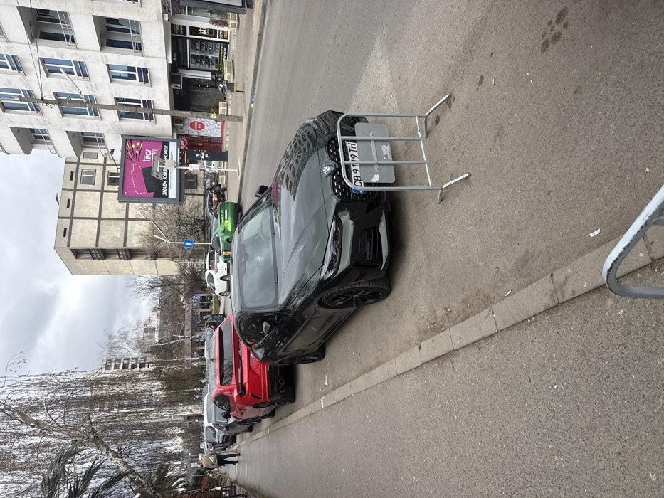 The image presents an urban street scene in Sofia, Bulgaria, under an overcast sky. In the immediate foreground, a light grey metal crowd control barrier stands on an asphalt surface, partially obscuring a darker grey, curved metal railing in the lower right. Parked directly behind this barrier, on the asphalt and partially on a concrete sidewalk, is a dark green BMW 4-series coupe displaying Bulgarian license plate "CB 9119 TH" on its front bumper. Behind the BMW, a red Lamborghini Urus SUV is parked. Further down the street on the left, additional vehicles are parked along the curb. One person is visible walking away from the camera on the concrete sidewalk on the left. The street itself is asphalt. On the right side, a multi-story building with white facades and multiple windows is present, featuring commercial establishments on its ground floor. A large, illuminated billboard displaying pink and purple graphics and Cyrillic text, including "ЗНАЕМ КАКВО ПРАВИШ!", is mounted on a pole between this building and an older, beige multi-story building with distinctive dark horizontal and vertical banding in the background. On the opposite side of the street, a bright green car and a white SUV are parked, with at least two motorcycles visible further down. Deciduous trees, predominantly bare, line the left side of the street, alongside a single palm tree on the far left. Utility poles and a blue circular traffic sign are also present. The ground surfaces show signs of use, including some scattered litter.