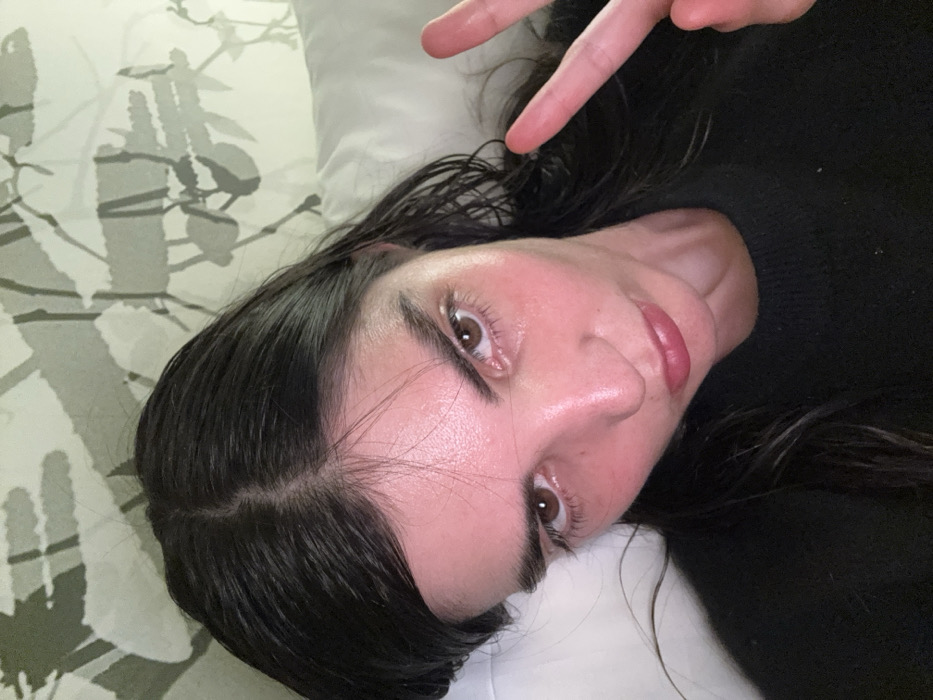 A selfie shows a fair-skinned person with dark, wet hair parted on the side. They are lying down, facing the camera, with their head tilted. One hand is raised, making a peace sign. The person has brown eyes, a prominent nose, and pink lips. They appear to be on a pillow, with a patterned comforter in the background. They are wearing a black top. The lighting highlights the shiny texture of their hair and skin.