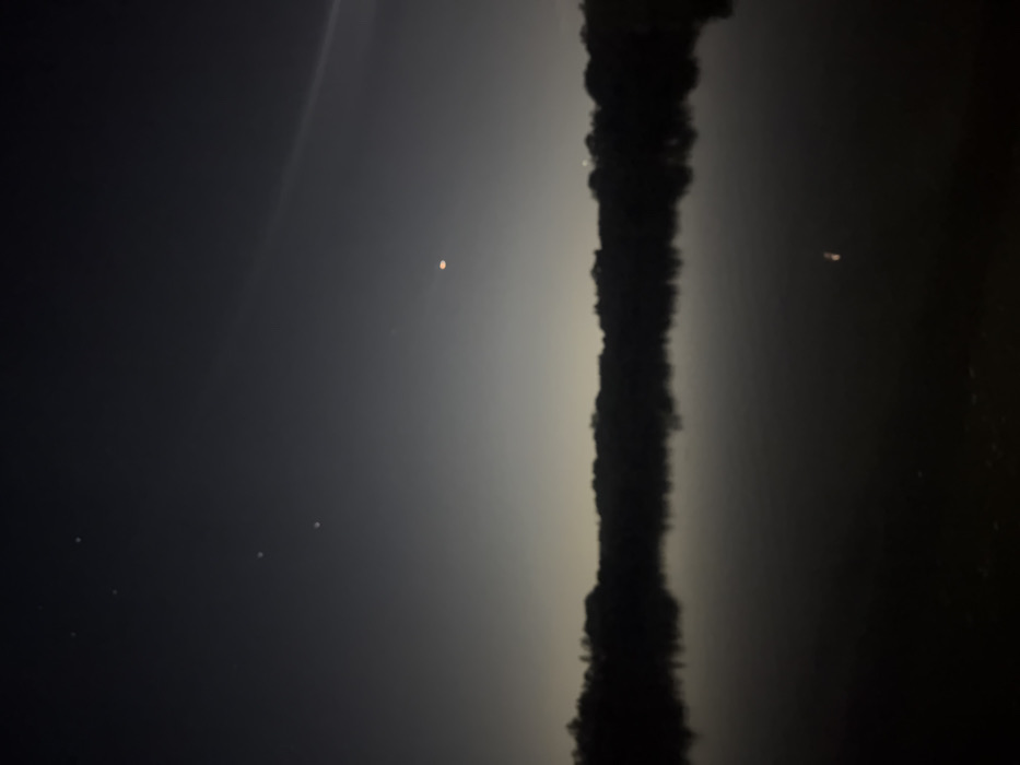 The image presents a nighttime panorama in El Cazador, Argentina, featuring a tranquil body of water under a dark sky. The immediate foreground is obscured by darkness, leading into a broad expanse of still, dark water that occupies the central and lower portions of the frame. This water reflects ambient light sources as faint, distorted glows. A continuous, dark silhouette of trees or dense vegetation forms the distant horizon, demarcating the water from the sky. The sky above transitions from a lighter gray-blue glow near the horizon, indicative of distant light pollution, to a darker gray overhead. Several faint white points of light, consistent with stars, are visible in the upper left quadrant. A distinct, reddish-orange, slightly elongated luminous object is situated in the upper right quadrant of the sky, with a corresponding, dimmer reflection visible on the water's surface directly beneath it. A faint, linear, lighter streak is also present in the upper right sky. No individuals, specific actions, or discernible man-made structures are visible within the frame. The scene is characterized by low light conditions and stillness.