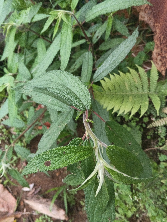The scene is located in the city of Banteay Srei, Cambodia. The image presents a close-up view of dense green foliage, appearing moist. The primary subject is a plant featuring multiple dark green, textured leaves with serrated margins, many covered in small water droplets. A prominent ovate-lanceolate leaf in the upper-middle of the frame distinctly displays these droplets and a central midrib. The plant's stems are reddish-brown and exhibit light hirsute textures. Lighter green, elongated new leaf growth is visible towards the bottom of the frame. In the background, additional green leaves with similar characteristics are present, some showing minor perforations consistent with insect activity. To the right, a portion of a light green fern frond with distinct pinnate divisions is partially visible. In the upper-right quadrant, a blurry, reddish-brown, textured object, possibly a tree trunk or weathered stone, is partially present. The ground beneath the vegetation appears as dark soil. No people, subjects, actions, or interactions are depicted. The environment is a natural, humid, and densely vegetated outdoor setting.