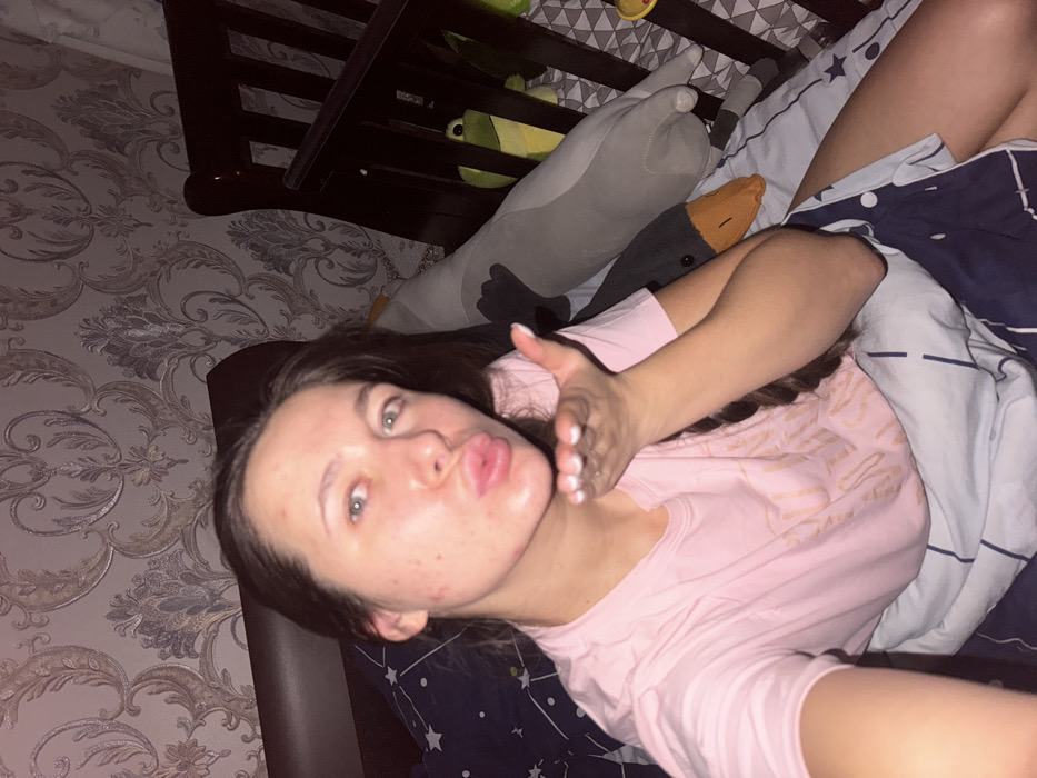 A woman lies sideways in bed, facing the camera with pursed lips and an outstretched hand as if blowing a kiss. She wears a light pink T-shirt and appears to be in a room with patterned wallpaper and a dark-colored crib visible in the background, filled with stuffed animals. The bedding is a mix of dark blue and white with star and line patterns. Her complexion is fair and has some visible blemishes.