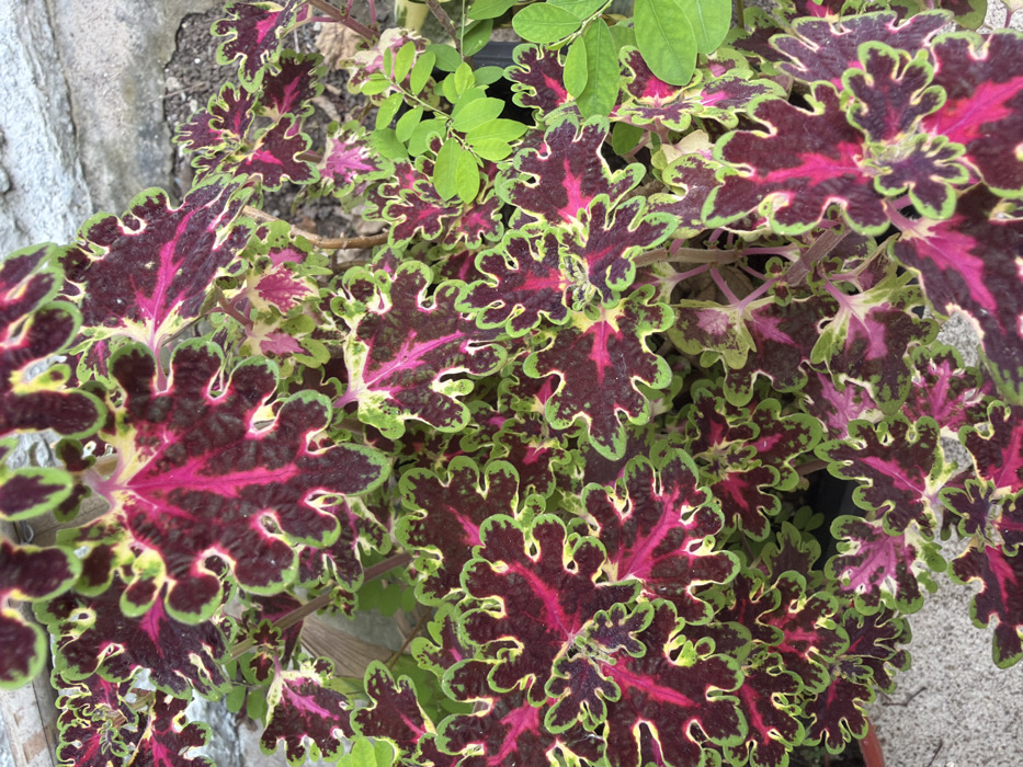 A vibrant Coleus plant with intricately patterned leaves dominates the frame