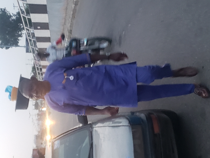 The scene depicts an urban street in Lokoja, Nigeria, during low light conditions, likely twilight or dawn. A dark-skinned adult male is in the foreground, walking towards the viewer. He wears a royal blue traditional Nigerian tunic and trousers, with dark brown loafers. A light-colored identification badge or pendant is clipped to his left chest pocket. He carries a dark basin containing a light blue object on his head. A watch is visible on his left wrist. To the left of the primary subject, the front-left section of a light-colored sedan is visible, with its headlights illuminated. In the right mid-ground, a second dark-skinned male is riding a dark-colored motorcycle away from the viewer, exhibiting motion blur. The road surface is asphalt. The background features a concrete barrier or wall with alternating dark and light vertical stripes, supporting metal railings, consistent with a bridge or elevated roadway structure. Distant vehicle headlights and streetlights are visible, along with sparse foliage against a pale grey sky.
