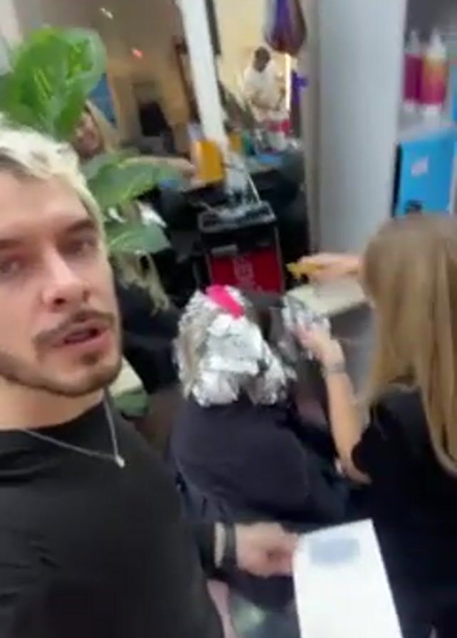 A man with platinum blonde and gray hair is standing in a salon, recording a selfie video