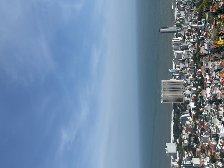 A vertical view shows a blue sky with clouds on the left, transitioning into a blue-grey ocean in the center. On the right, a dense cityscape with buildings and red-tiled roofs stretches along the coastline. Several high-rise buildings stand out amongst the smaller structures. The scene is bright and appears to be taken during the day.