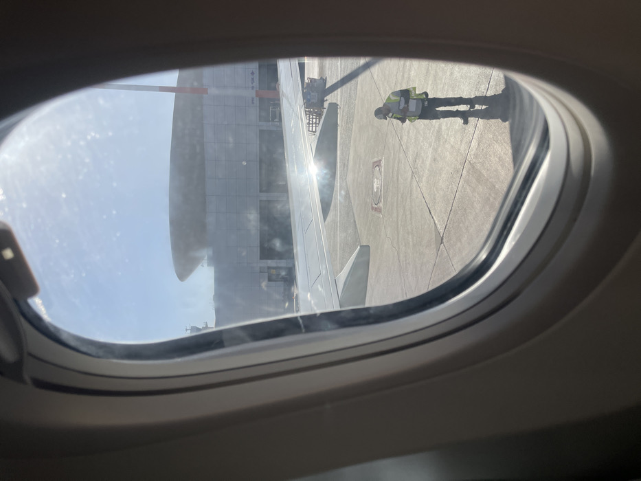 The image depicts an exterior view from the window of an aircraft parked on an airport tarmac