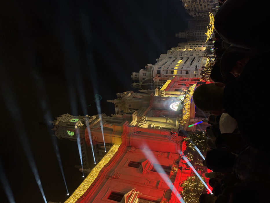 A brightly illuminated building at night, decorated with white and gold lights. Spotlights shine upwards, creating bright beams in the dark sky. To the right, a crowd of people is partially visible. The building is multi-storied with ornate architectural details, and a clock tower can be seen. It is probably a festive celebration or event.