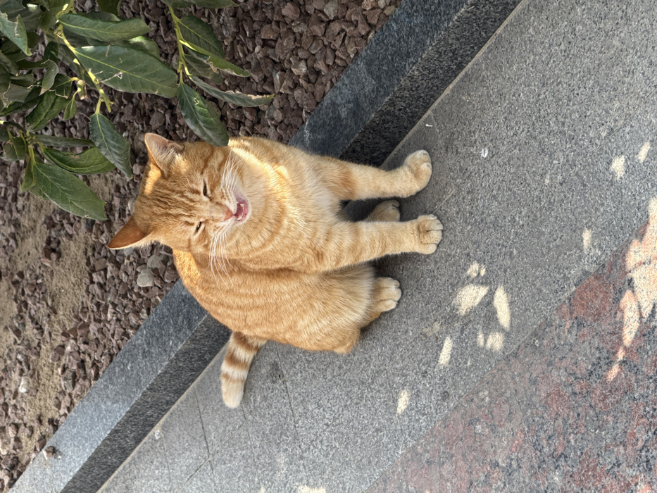 - "A ginger tabby cat is depicted sitting upright on a light gray speckled granite paving slab in a public outdoor area of Anapa, Russia" by FM-Q0AMB2, licensed under CC BY 4.0