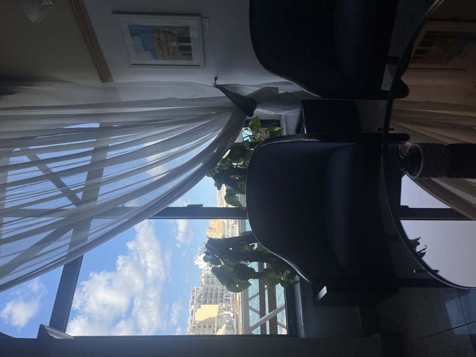 The image depicts an interior room with a panoramic view of Saint Paul's Bay in Malta. A large window, framed by drawn-back sheer white curtains, dominates the scene, offering a bright exterior view. The right curtain is cinched with a dark tie-back. Two dark-colored, upholstered armchairs with visible wooden frames are positioned in the foreground, facing the window. Between these chairs, a round, dark-surfaced coffee table holds a small potted succulent plant in a textured pot. Two large green potted plants sit on the windowsill, partially obscuring the lower pane. Beyond the window, the exterior features a clear blue sky with scattered white clouds. The turquoise waters of Saint Paul's Bay are visible, with a horizontal structure (possibly a railing or pier) extending across the water. On the distant shore, numerous multi-story, light-colored buildings line the bay. A prominent, light-colored fortified structure, identifiable as Wignacourt Tower, is visible in the mid-distance on the opposite side of the bay. The interior room has light-colored walls, with a framed artwork depicting a classical building hanging on the wall to the right of the window. No people are present in the scene.