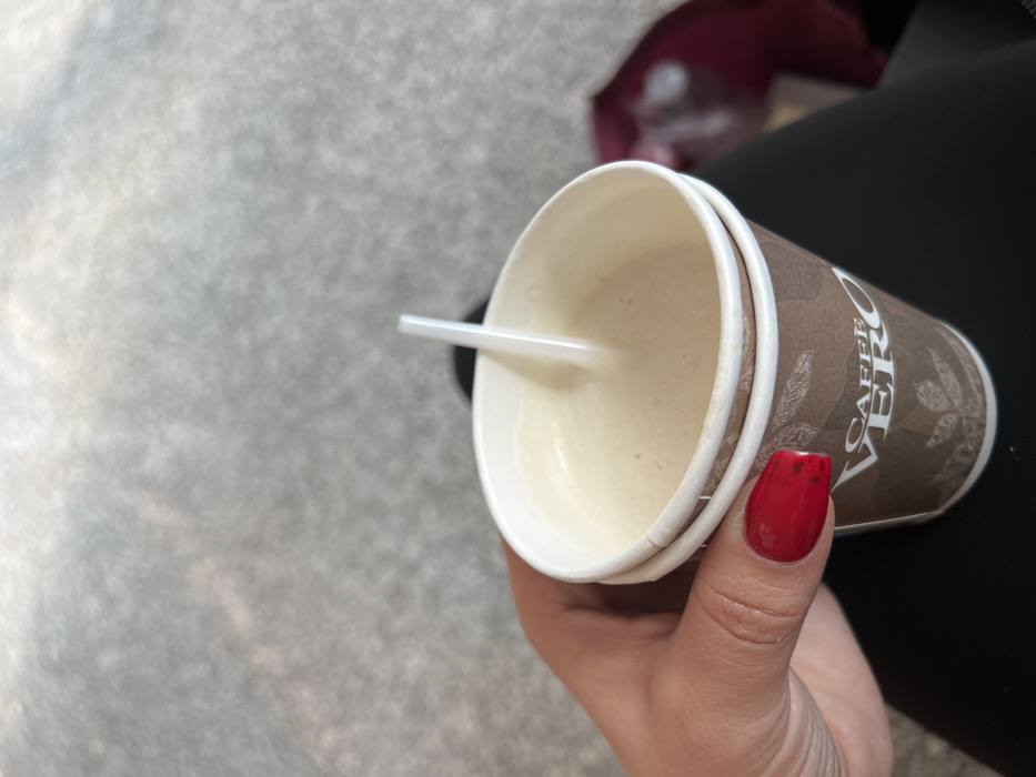 A right hand, with a red-painted thumbnail exhibiting minor dark speckles, is shown holding a brown disposable paper cup. The cup, bearing the brand "CAFFE VERO" and a leaf pattern, contains a light brown, frothy liquid, into which a short white plastic straw is inserted. A second, identical paper cup is nested underneath the primary cup. The hand and cup are positioned over a dark, solid fabric surface. The background is composed of a blurred, light grey, textured surface, with a indistinct dark red object visible on the right. The scene is located in Ouled Tayeb, Morocco.