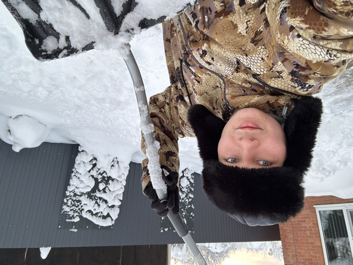 A man wearing a camouflage jacket and a black fur hat shovels snow with a black shovel. He looks directly at the camera. The shovel is full of snow, and there is a thick layer of snow on a building and the ground. A brick house is visible in the background, partially obscured by snow. The image is rotated upside down.