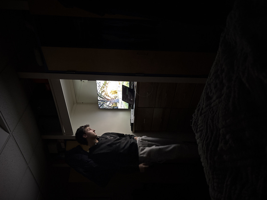 - "A young man lies on his back in a dimly lit room, gazing up at a flat-screen TV mounted on the wall" by FM-5oJwf2, licensed under CC BY 4.0