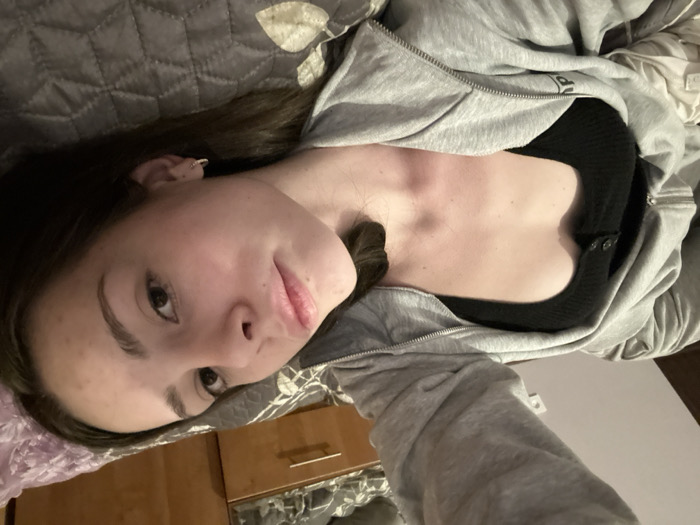 A young woman lies at an angle, facing the camera. She wears a black top and a gray zip-up hoodie. Her dark hair is partially visible against a patterned gray pillow and bedding. Her skin appears fair, and her expression is neutral. A cabinet is partially visible in the lower left. The background also includes a white wall in the lower right corner.