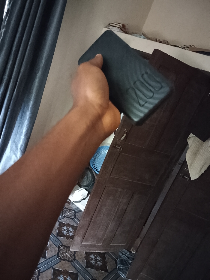 A medium-dark skinned right forearm and hand hold a dark-colored, textured rectangular power bank with "200" embossed on its surface. The image is captured from a first-person perspective, angled downwards and to the right, showing an indoor setting in Unknown, Unknown. To the left of the arm, a dark blue or grey pleated curtain hangs against a plain light-colored wall. To the right and below the arm, two dark brown wooden paneled doors, possibly closet doors, are visible, one with a metallic handle and hinges. A light-colored cloth hangs over the right door. The floor exhibits patterned tiles with a repeating geometric design in brown, beige, and dark blue/grey hues. Behind the doors, a blue plastic woven basket, a dark circular object resembling a fan or speaker, and indistinct white items are visible on the floor. Above the doors, on a ledge, stacked books or papers and eyeglasses are present.
