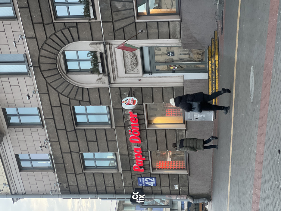 The image depicts the facade of a multi-story grey stone building at Prospekt Nezavisimosti 42, Minsk, Belarus. The lower section features a darker, large block-patterned stone, while the upper section has lighter, smaller block-patterned stonework. Multiple rectangular windows with grey frames reflect a pale blue sky. Several security cameras are mounted on the facade between the first and second story windows. A prominent red neon sign for "Papa Döner" is affixed to the first floor, accompanied by a smaller circular logo. To the left, a black "CO FIX" sign and a blue street sign indicating "НЕЗАВИСИМОСТИ 42" are visible. Below the "Papa Döner" sign, ground-floor windows display internal lighting, one with a red diamond-patterned covering and another with a warm yellow reflection. The building's main entrance is recessed, featuring grey-framed glass double doors, accessed via three yellow-painted steps. Above this entrance, a Belarusian flag is mounted on an angled pole. Further up, an arched window with a small planter containing greenery is set into the facade. On the sidewalk in the foreground, two individuals walk from left to right. The first individual, a male, wears a long olive-green puffer coat, dark pants, and dark shoes. The second individual, a female, wears a dark puffer coat, dark pants, dark boots, and a white beanie, carrying a dark handbag on her left shoulder. Between them and near the building wall, a grey trash receptacle labeled "Спасибо" (Thank you) is present. The sidewalk is paved with grey and reddish pavers, bisected by a prominent yellow line. A circular manhole cover is visible further along the sidewalk. The overall lighting suggests an overcast or non-sunny day.