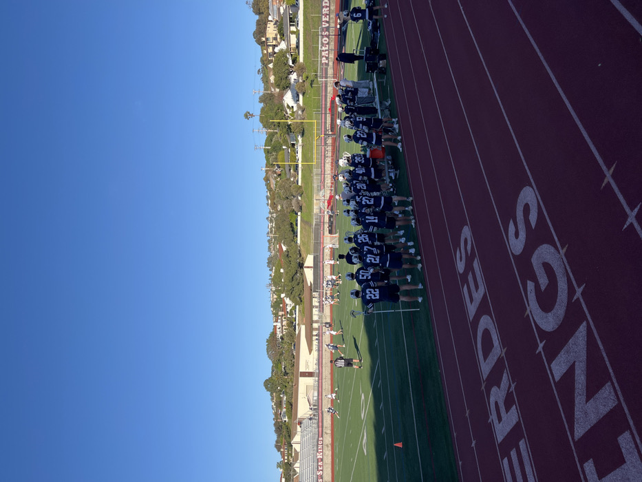 A sports team in navy uniforms lines up on a green field next to a track marked "SEA KINGS