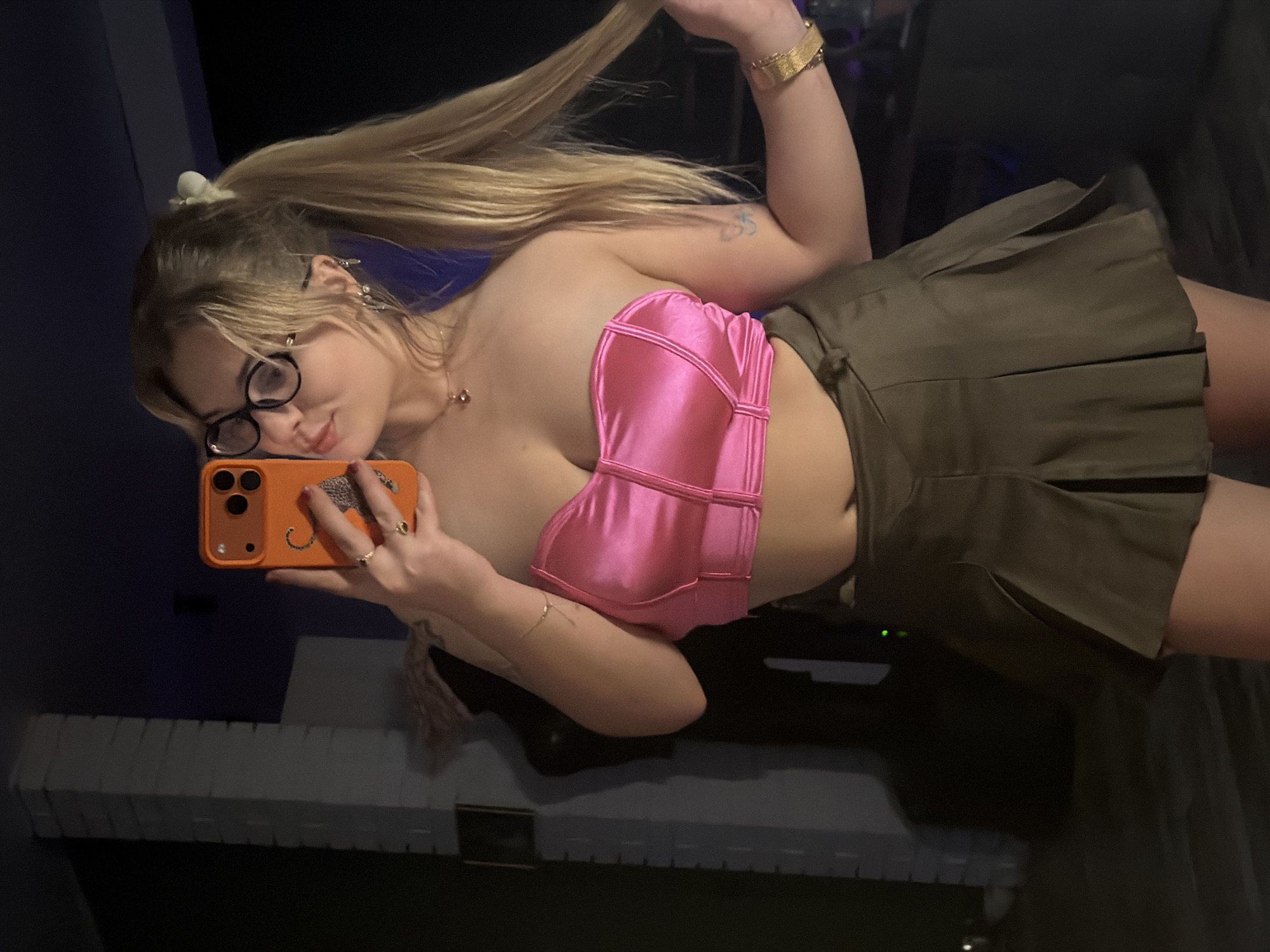 A young woman is shown in a selfie, wearing a pink satin bustier and an olive green pleated skirt