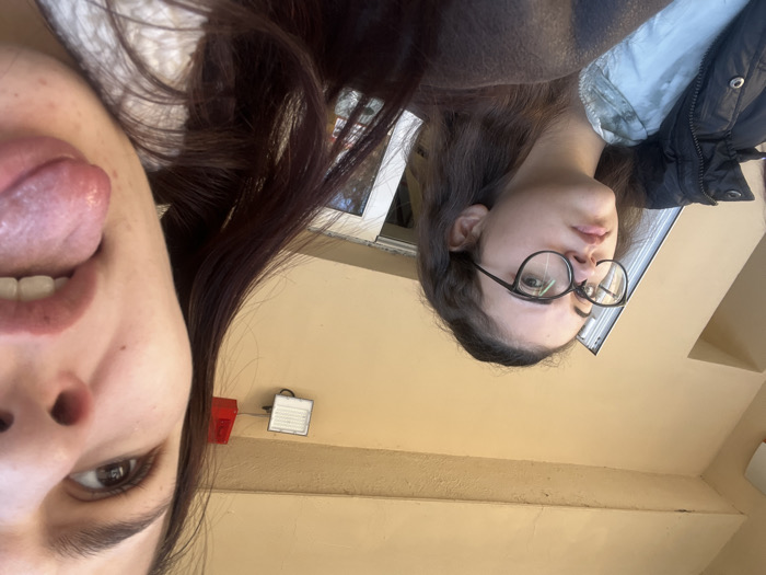 The image captures two young females outdoors in Bankya, Bulgaria. In the left mid-ground, a female with dark, wavy hair and black-rimmed glasses wears a dark puffer jacket over a light top, looking upwards and to her right with a neutral expression. In the extreme foreground on the right, the lower right portion of a second female's face is visible, including her right eye and mouth with her tongue extended. The background consists of a pale yellow building exterior, featuring an overhang ceiling with visible cracking, and a door or window frame. A rectangular white light fixture and a red alarm device are mounted on the exterior wall. Natural light illuminates the scene.
