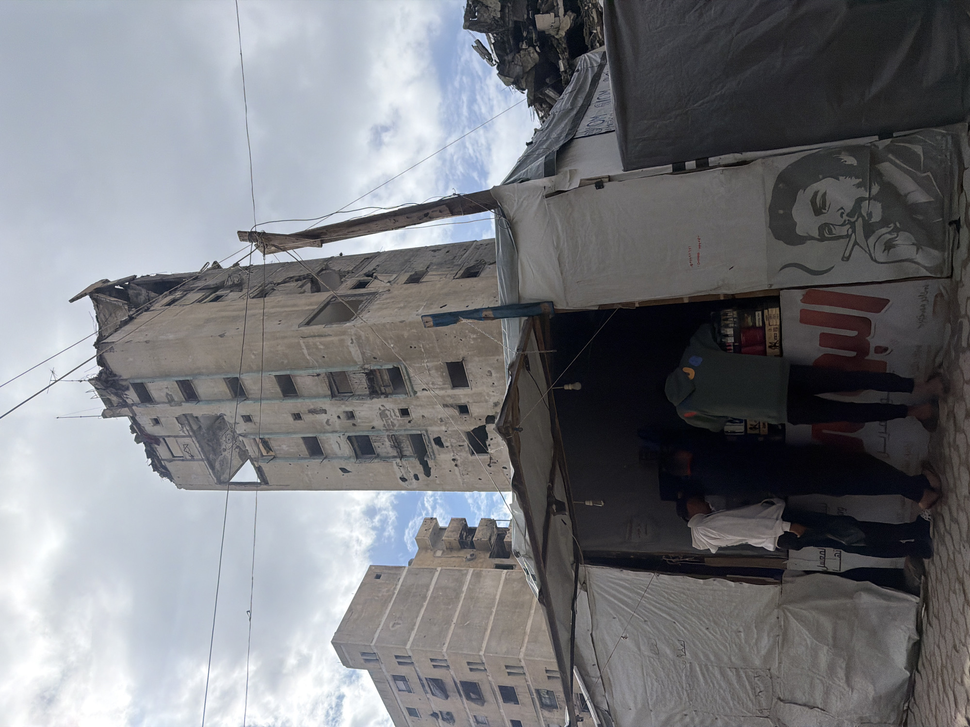 The scene depicts a street in Gaza, Palestinian Territory, characterized by significant destruction and makeshift commerce under an overcast sky with patches of blue. In the foreground, a rudimentary stall constructed from white and gray tarpaulins and wooden framing operates. An awning extends forward, beneath which three male individuals are present. The person on the left wears a white hooded sweatshirt and dark pants. The central figure is dressed in dark clothing. The individual on the right wears a green hooded sweatshirt with multicolored patches on the back. They appear to be patrons interacting with items displayed on shelves inside the stall, which contain various products like cans and bottles. The exterior of the stall features Arabic script, including "البير" (Al-Bir) in red, and a black-and-white stencil-style image of Che Guevara smoking a cigar. Dominating the midground is a severely damaged, multi-story concrete building with numerous impact holes, missing facade sections, exposed interior elements, and structural collapse evident, particularly at its upper levels. To its left, another multi-story concrete building, also appearing damaged with darkened and missing windows and compromised balconies, stands further back. Between these structures, a smaller, similarly damaged building is visible. To the right of the stall, a substantial pile of concrete rubble and debris indicates a collapsed structure. Overhead, multiple black wires, likely for power or communication, crisscross the frame, supported in part by a crude wooden pole leaning against the stall. The ground in the immediate foreground consists of uneven paving stones or concrete.