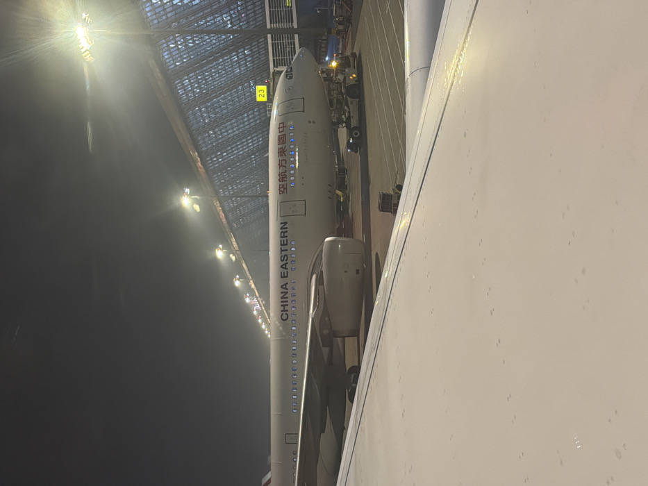 The scene depicts a nighttime view of an active airport tarmac at Shanghai Pudong International Airport (PVG) in Pudong, China. The primary subject is a large, white China Eastern Airlines passenger aircraft, displaying "CHINA EASTERN" in blue text and Chinese characters "中国东方航空" on its fuselage, parked at a gate. The aircraft's forward section and engines are visible, with ground support equipment, including a pushback tug, positioned near its nose gear. In the background, a brightly illuminated, modern terminal building with a distinctive glass and steel facade is prominent. A yellow sign bearing the number "23" is visible on a structure associated with the terminal or jet bridge. The image is captured from an elevated perspective, likely from the cabin of another aircraft, with a portion of a white aircraft wing, showing small droplets on its surface, occupying the lower foreground. The environment is heavily lit by numerous tall floodlights, casting strong light and reflections, with a visible haze in the night air. No identifiable individuals or specific human actions are clearly discernible.