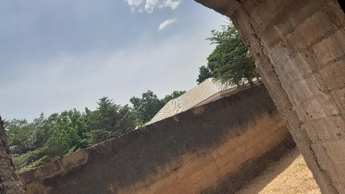 The image depicts an outdoor scene in Lafia, Nigeria, captured from a tilted perspective, likely through a structural opening or from an elevated position. In the right foreground, a vertical section of a light brown, rough-textured concrete block wall is prominently visible, extending diagonally upwards from the bottom right corner. A lower, dark grey concrete wall or barrier, showing signs of weathering, runs horizontally across the mid-bottom and angles down towards the bottom left. Beyond this barrier, a light-colored, angular roof with a distinct, regular grid-like pattern, consistent with corrugated metal or tiling, is visible. Dense green tree foliage occupies the midground and left side of the frame, partially obscuring the roof structure. The upper background features a light blue sky with sparse white clouds. No individuals, specific man-made objects other than the described structures, or apparent actions are discernible within the frame.