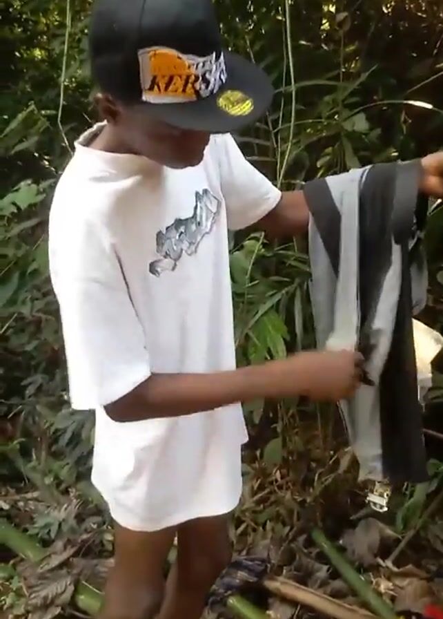 A young, dark-skinned person stands outdoors in what appears to be a wooded area. They are wearing a white t-shirt, a black baseball cap with a gold logo, and no visible pants or shorts. The ground is littered with dry leaves and green bamboo-like plants. In their hands, they hold a pair of gray athletic pants, a green cell phone, and a white plastic bag. The person looks around while holding these items. The background consists of dense green foliage.
