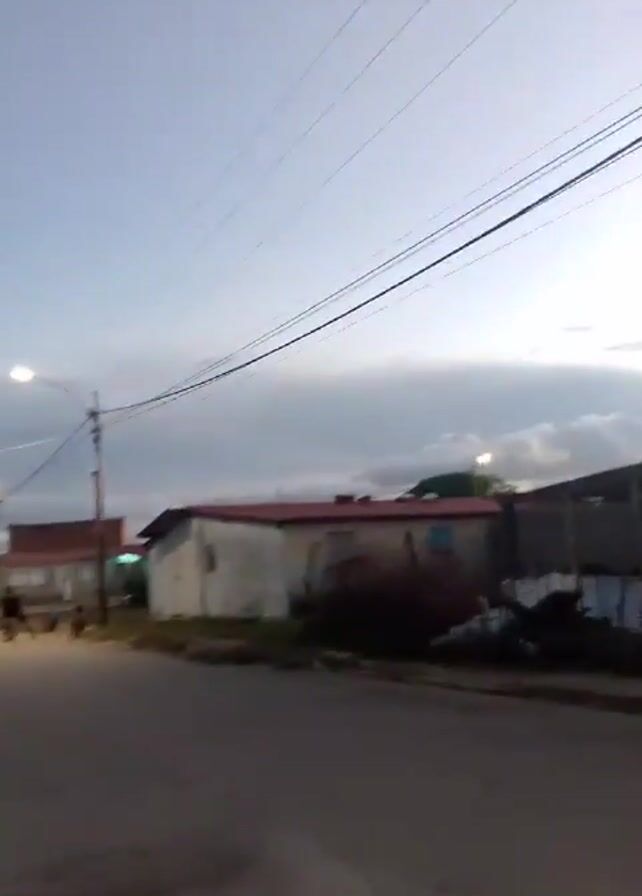 street in a residential area at dusk. The road is paved and has some patches. There are houses on either side of the street, some with red roofs. Power lines run across the top of the frame against a cloudy sky. In the distance, a person is walking down the street. The video is shaky and slightly out of focus.