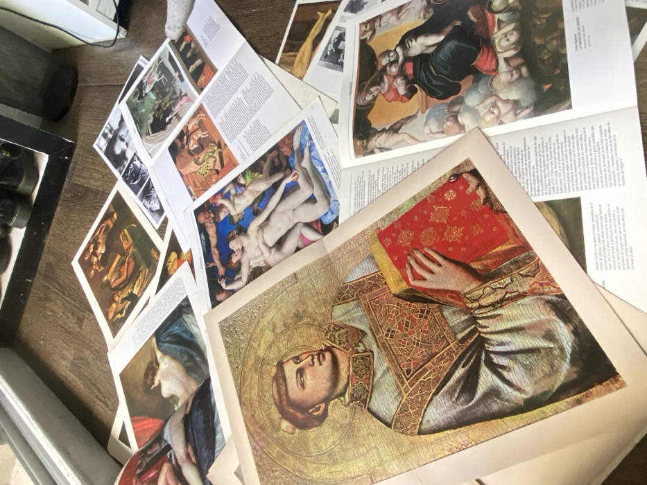 Art prints and pages from art books are scattered on a surface. Images include Renaissance paintings with religious and mythological themes. A Madonna and Child, a scene of nude figures, and a portrait of a saint with a book are visible. Text accompanies several images, suggesting they are from a printed source. The arrangement indicates a collection or a study of art.