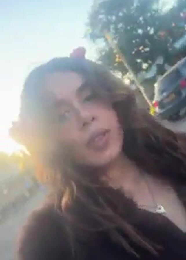 A young woman is standing in what appears to be a parking lot. She is wearing a dark brown fur coat and has long brown hair with a few flowers pinned in it. She has a nose ring and a necklace. The sun is shining behind her. She makes a kissy face and then sticks out her tongue and smiles. There are cars parked behind her and people walking around in the background.