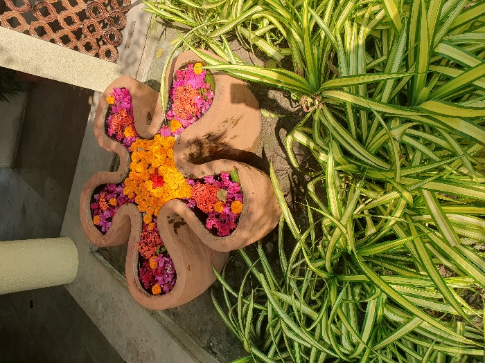 A flower-shaped terra cotta planter with five lobes sits on a stone surface