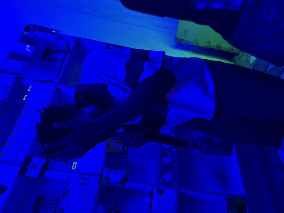 A person, seen in blue lighting, is holding their head with one hand while the other grasps a dark object, possibly a microphone. The person is wearing a white shirt with a dark-colored sleeve. Behind them, shelves are filled with numerous small boxes or items, possibly in a retail setting. A portion of another person is visible at the top of the image.