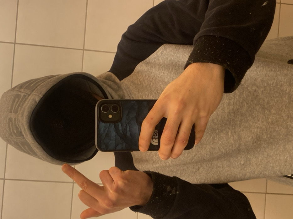 person in a gray hoodie with a black undershirt. The person is holding a black phone with a blue-toned case in one hand, while extending their middle finger with the other. The person's face is obscured by the hood. The background appears to be a white tiled wall. The image is likely taken in a mirror, creating a reflection.