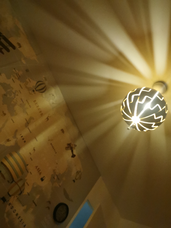 - "A modern ceiling light fixture with a spherical shade casts dramatic shadows across a wall featuring a world map" by FM-fEOKj1, licensed under CC BY 4.0