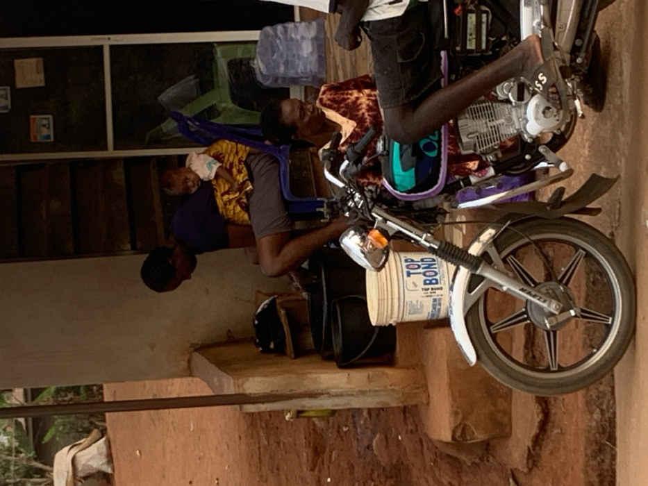 Three people are on a motorcycle. A baby sleeps on the back of a person seated behind the driver. Another person sits behind them. The motorcycle is parked next to a building. A bucket of Top Bond sits on the platform next to the front wheel. The surroundings are simple, suggesting a rural environment. The scene captures everyday life, with family members on a mode of transport.