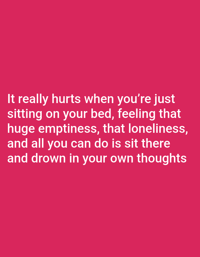 A poignant message rendered in white text against a solid pink background. The text expresses feelings of emptiness and loneliness experienced while sitting on a bed. It conveys the sensation of being overwhelmed by one's thoughts, as if drowning in them. The simple background emphasizes the emotional weight of the written sentiment.