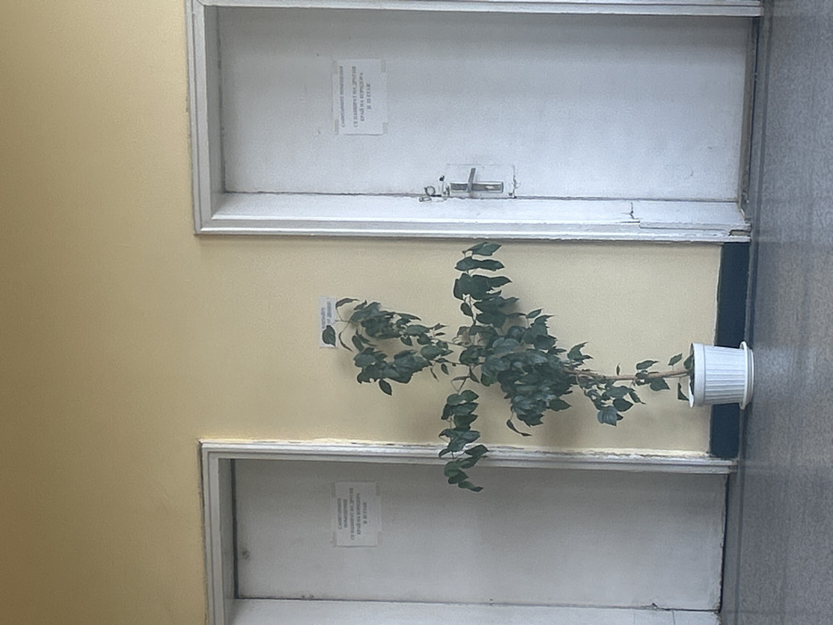 The image displays an interior corridor within a building located in Varna, Bulgaria. A pale yellow wall spans the background, meeting a dark grey, speckled floor. Two closed, light-colored wooden doors, exhibiting worn frames, are centered in the frame. Between these doors, a green-leafed plant in a white fluted plastic pot with a matching saucer rests on the floor. Each door features an identical white rectangular sign in Bulgarian, which translates to "Sanitary facilities are located at the other end of the corridor and on the 2nd floor." The right door is equipped with a silver-toned handle and an affixed metal security plate. A smaller, rectangular white sign in Bulgarian, translating to "fire hazard do not touch!", is mounted on the wall above the plant. No individuals or dynamic actions are depicted.