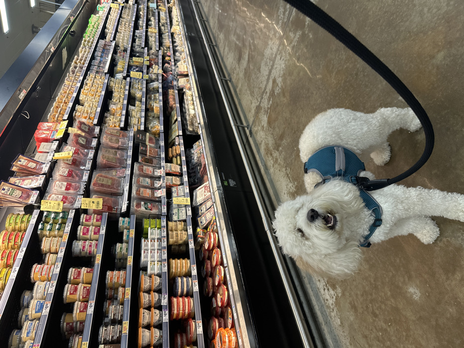This image captures the interior of a grocery store aisle in McAllen, United States of America. The central subject is a medium-sized white dog with shaggy, curly fur, wearing a teal-colored harness and a black leash, standing on a polished concrete floor. The dog faces slightly right, its mouth open. In the background, a lengthy refrigerated display case lines the aisle, stocked on multiple shelves with various packaged food items. The left side of the display holds numerous circular plastic containers of dips, including "Traditional Hummus" and "Red Pepper Hummus." The right side features vacuum-sealed packages of deli meats, such as "Prosciutto," alongside assorted cheeses and other prepared items. The environment is illuminated by overhead artificial lighting. No human individuals are visible.