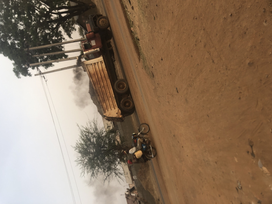This image, taken in Masaka, Nigeria, depicts a busy roadside scene under a hazy sky. In the mid-ground, a large, older model dump truck with a red cab and a light-colored, heavily rusted dump bed is observed. The truck's bed is fully loaded with dark, granular material, consistent with dirt or gravel, and it emits a substantial plume of dark exhaust smoke from its vertical exhaust stack on the right side. The vehicle is positioned on an unpaved, reddish-brown dirt road, angled slightly uphill, and appears to be in motion, moving from left to right across the frame. To the left of the dump truck and closer to the foreground, a dark-colored utility motorcycle is in motion, also traveling from left to right. Two individuals are riding the motorcycle: the driver, dressed in a light-colored shirt, and a passenger behind them, wearing a darker shirt. A large, light-colored sack or bundle is secured to the rear of the motorcycle. The immediate foreground consists of uneven, reddish-brown dirt, indicating a well-traveled unpaved area. In the background, to the left of the vehicles, a small tree with green foliage is visible. Further left, indistinct structures, potentially buildings or industrial facilities, are present, partially obscured by low walls or fences and mounds of excavated earth or refuse. To the right of the dump truck, several tall, raw wooden utility poles with power lines extend upwards, situated against a backdrop of denser green trees. The overall environment suggests an active, semi-urban or rural setting with ongoing work or traffic, characterized by unpaved roads and visible air emissions from heavy vehicles.