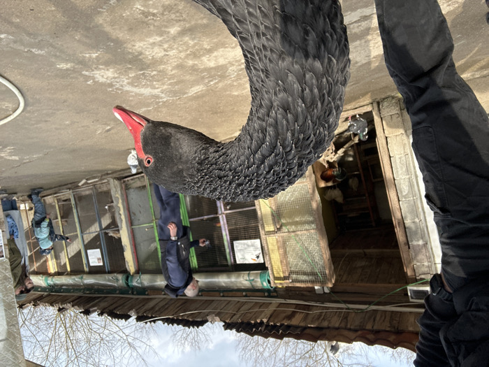 The image depicts an outdoor animal enclosure in Leskovets, Bulgaria. In the foreground, the head and arcing neck of a black swan are prominently positioned, featuring black plumage, a bright red beak with a white tip, and a red eye. The lower legs of a person in black pants are partially visible on the far left, adjacent to the swan's body. In the midground, a series of interconnected, rustic animal pens extends horizontally under a corrugated roof. These enclosures, constructed with wood and wire mesh, contain various poultry, including chickens, roosters, and pigeons. A man in a dark blue jacket and vest stands centrally, facing the enclosures and holding an object towards a cage. To his right, a small child in a light blue puffer jacket points into one of the enclosures, observed by two adults standing behind them. An open doorway on the left provides a view into a dimly lit interior space containing more poultry. The ground consists of concrete, and a white coiled hose lies on the right side. The background features bare trees against a light blue sky with scattered clouds.
