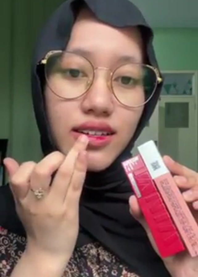 A woman in a black hijab and gold glasses is demonstrating makeup in front of a camera. She’s wearing a floral-patterned dress and a ring on her left hand. She’s holding two tubes of Maybelline SuperStay Vinyl Ink lip color in her right hand. She uses the index finger of her left hand to smooth the red lip color on her lips. She has dental braces. The background includes a green curtain and a door leading to another room.