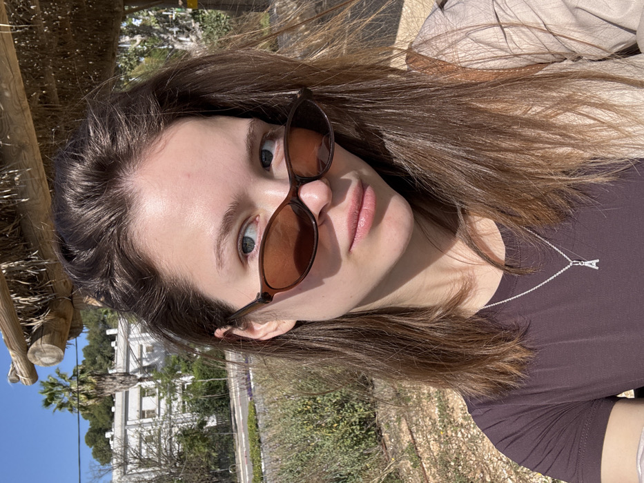 A young adult female is depicted in a close-up portrait, outdoors, under direct sunlight with partial overhead shade from a wooden pergola structure featuring dried vegetation. She has light skin, brown hair with a left part, and light-colored eyes. She wears brown-tinted oval sunglasses, through which her eyes are visible. Her lips are slightly parted. She is wearing a dark brown short-sleeved top and a silver chain necklace with a small, stylized letter "A" pendant. A light-colored garment or strap is visible on her right shoulder. Her gaze is directed towards the viewer with a neutral expression. The background reveals a landscaped urban setting under a clear blue sky. To her left, a paved surface, likely a road or walkway, is visible next to an area of low-lying green and dry shrubbery. Further back, a tall palm tree stands in front of a multi-story, light-colored building characterized by multiple windows and an institutional architectural style. Additional green foliage and distant trees are visible around and beyond the building. The scene is located in Holon, Israel, consistent with an outdoor public area in the vicinity of the **Mediatech Holon complex or an adjacent urban park**.