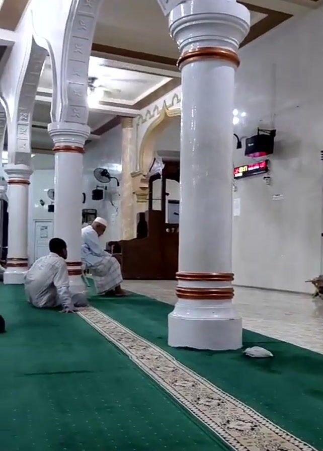 Inside a mosque, several men are sitting on a green carpet with an ornate pattern. The mosque has white pillars with orange accents. The ceiling is white and has several fans. A digital clock hangs on the wall. There is a bookshelf with books in the background. One man leans against a pillar. Most are seated in a relaxed position. The overall atmosphere appears calm and peaceful.