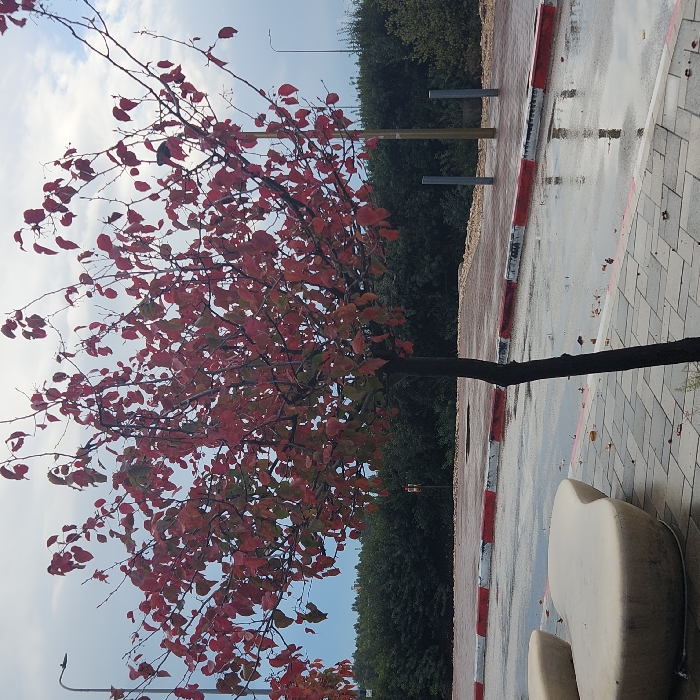The image depicts an outdoor scene in the Galil Elyon Regional Council, Israel, under an overcast sky. A small deciduous tree with predominantly red and some green leaves, indicating a transitional season, stands centrally, its slender, dark brown trunk slightly curving. To the immediate left of the tree, two light-colored, irregularly shaped, smooth concrete benches are visible on a paved area consisting of grey rectangular blocks. The ground around the tree and extending to the right is wet, reflecting the cloudy sky, suggesting recent precipitation. This wet surface is bordered by a curb painted in alternating red and white sections. Beyond this curb, an elevated, reddish-brown paved area is visible. In the background, a dense line of dark green foliage, possibly bushes or trees, stretches across the horizon. Scattered on the wet ground are several fallen red leaves. Infrastructural elements include a tall grey streetlamp on the far left, another light-colored pole further back to the right, and two shorter, grey cylindrical bollards positioned near the red and white curb. No people, animals, or explicit actions are visible within the frame.